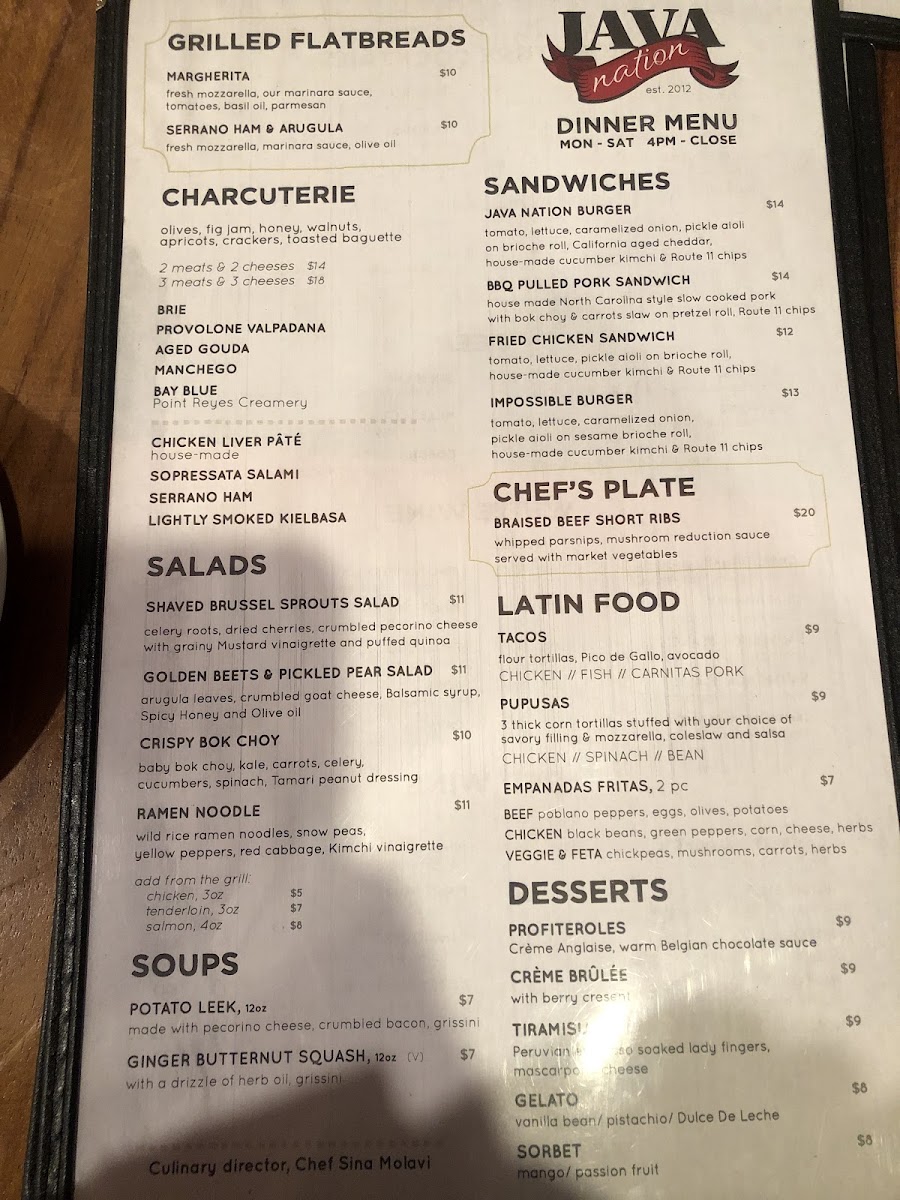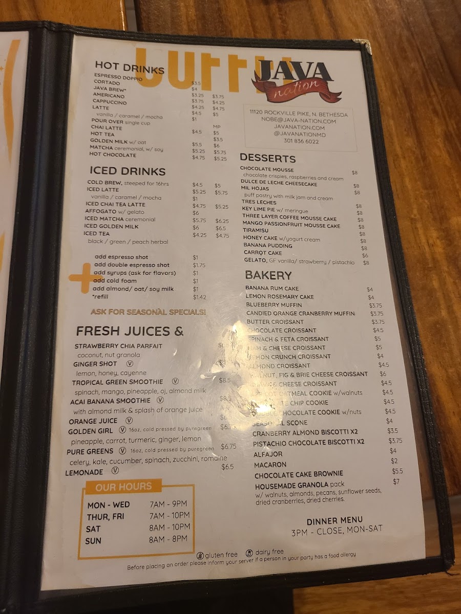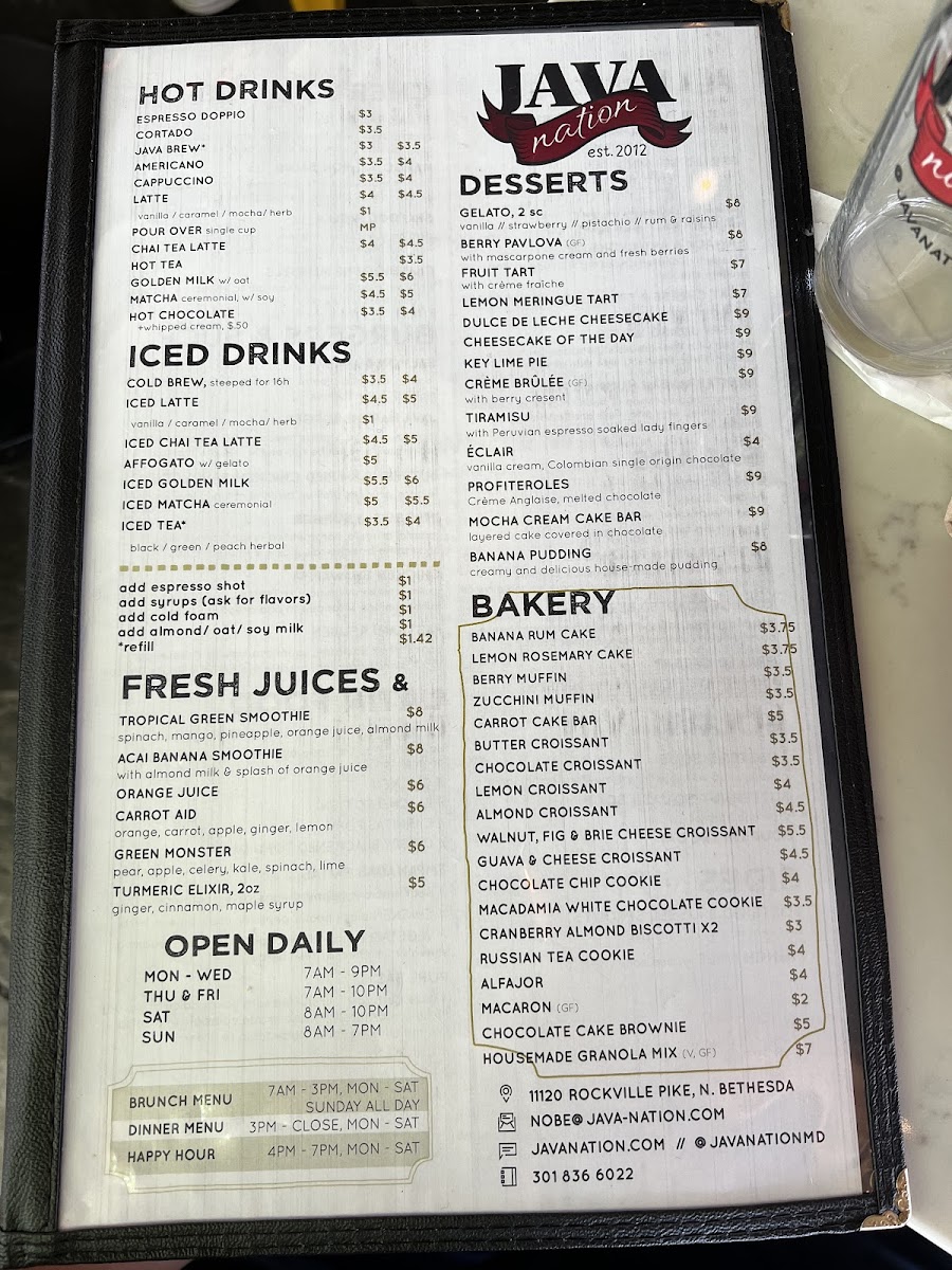 Welcome to Java Nation, a vibrant haven nestled at 11120 Rockville Pike, Rockville, MD. This charming spot is more than just a coffee shop; it’s a community gathering point where delicious cuisine and quality coffee meet. The breakfast menu features delightful options like the Ham & Cheese Omelet with gruyere, paired perfectly with fresh sides like home fries or a fruit bowl for just $19.20. Don’t miss the comforting Avocado Toast or tempting crepes, both priced at $15.60.